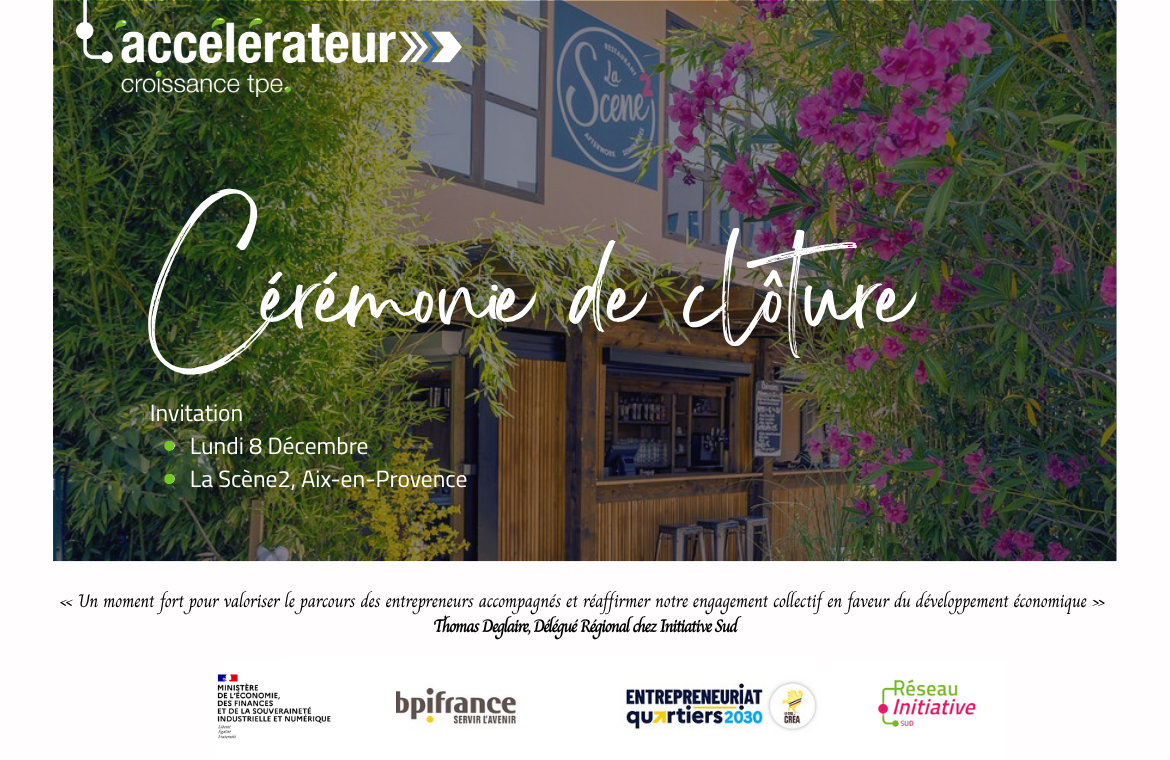 Le Réseau Initiative Sud a le plaisir de vous convier à la cérémonie de clôture du programme d’Accélération de TPE, déployé dans le cadre du dispositif national Entrepreneuriat Quartiers 2030, initié par l’État.